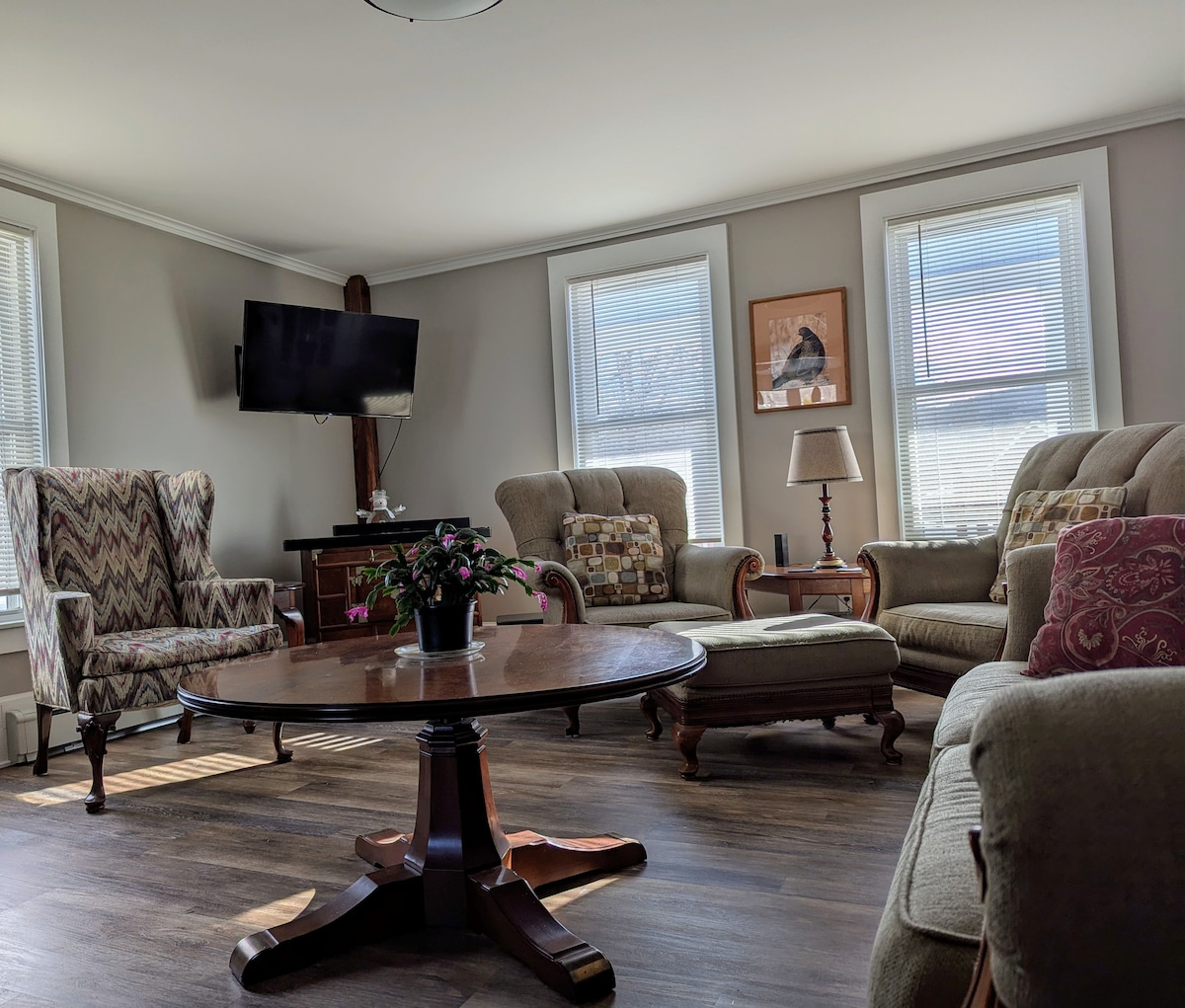 Private sitting room, bedroom and full bath, separated from main house. 5-minute walk to Plymouth State University. Close to Waterville Valley, Loon, and other ski resorts. Also close to lakes and hiking trails. Bedroom has a king size bed and reclining chair. Sitting room has a daybed with a trundle bed underneath. The sitting room also has a table with four chairs, a mini fridge, microwave oven, and Kreurig coffee maker. Plates, cups, silverware are also provided. Parking for three cars.