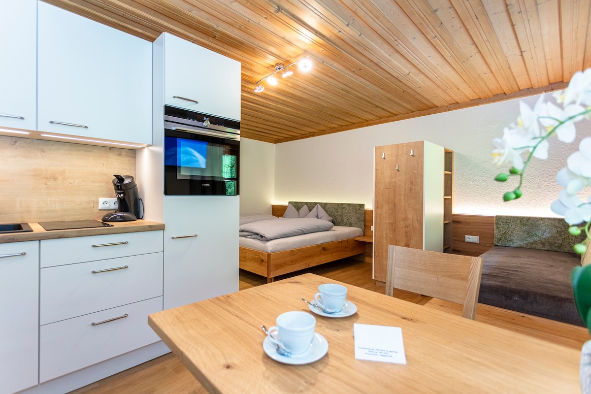 The apartment has recently been completely renovated, has a state-of-the-art interior and consists of an open space of 65 M2, which creates a very open and free feeling. The unique view over Lake Wolfgang can be enjoyed to the fullest. The luxurious bathroom including a huge bathtub, in combination with the ambient lighting, ensures ultimate relaxation. A box spring bed, a modern kitchen and a comfortable sofa ensure a perfect holiday feeling.