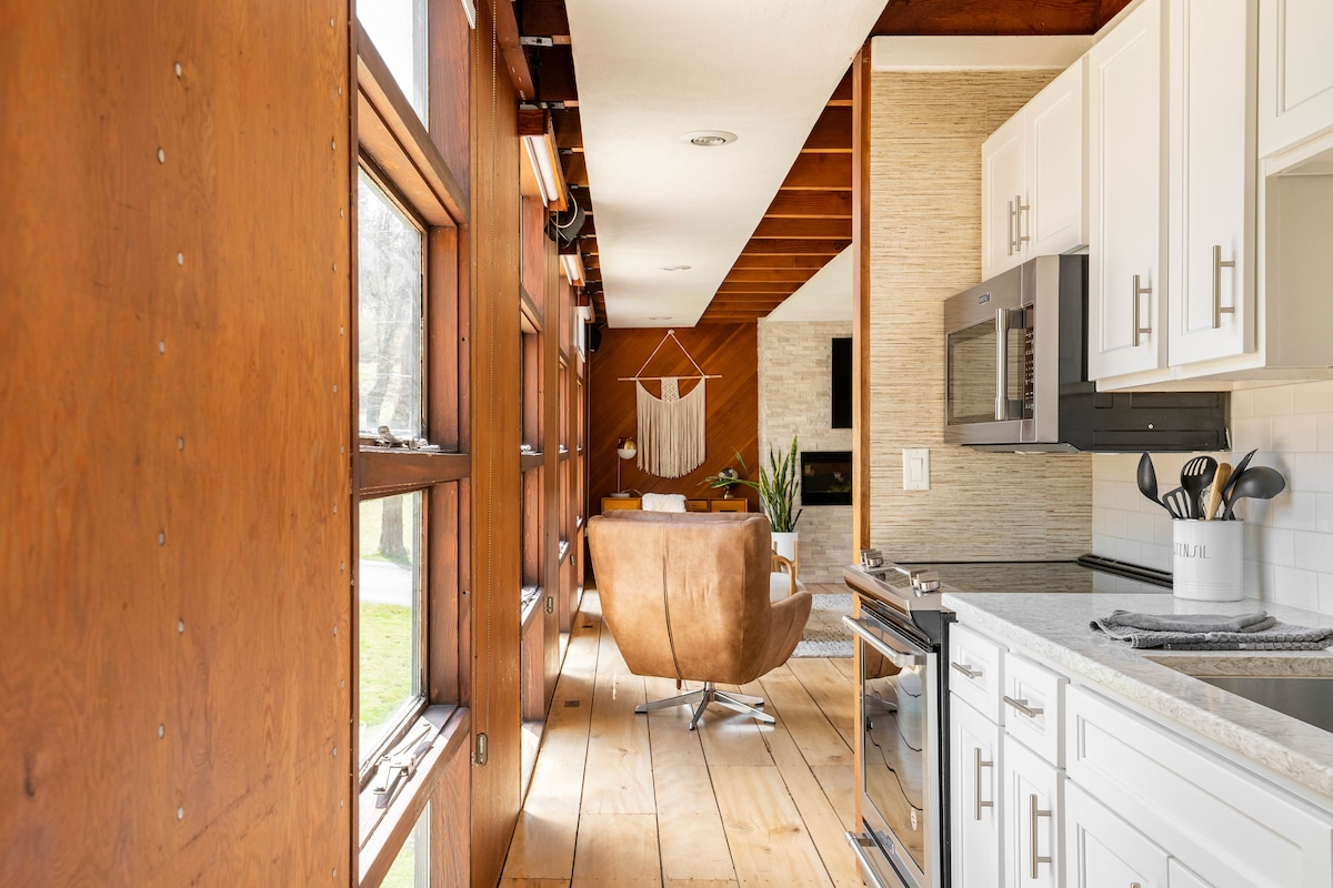 This one-of-a-kind mid-century modern home is perched above a peaceful mountain stream in Wernersville, PA. The home features two bedrooms, a full bathroom with a walk-in shower, and an open-concept dining and living area complete with a cozy modern fireplace and a 60” 4K TV. Unwind year-round in the spacious outdoor hot tub while taking in the soothing sounds of the creek and birdsong. Conveniently located just 10–20 minutes from hiking trails, shopping, and a wide variety of restaurants, the