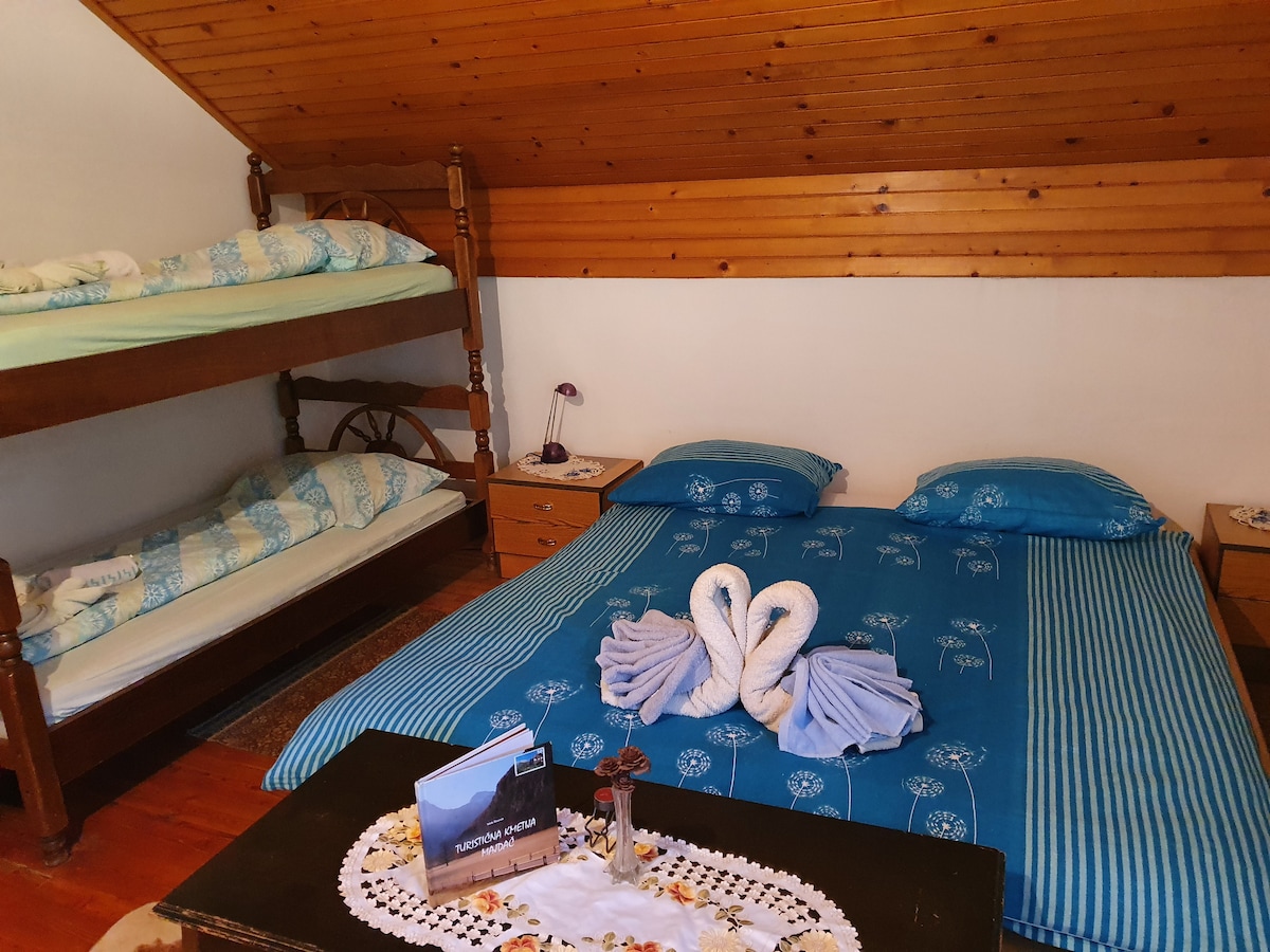 Spacious apartment in a farmhouse on the ecological farm Zvonik. A separate entrance with a large terrace, safely hidden from view with the green decoration of nature. Enjoy peace on the wooden terrace with a view of the mountains, domestic animals and breathe crystal clear air. Ideal for long walks in the forest, meadows, picking mushrooms, watching birds and plants. Rest your soul in the shade of a mighty linden tree, drink pure spring water and enjoy doing nothing.
