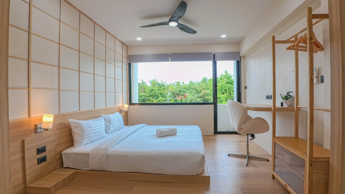 Wake up in your peaceful Japanese-style studio. Relax in your custom wooden bed, then enjoy fresh air on your balcony sofa facing nature. Perfect location: steps to FX Fitness, Ton Mai Spa & 9 min walk to Rawai Beach. Fast Wi-Fi, Smart TV & ceiling fan. Electricity is included in the price. Your daily gift: A free mini-workout! You just have to climb one floor (stairs only, no elevator) to reach your private sanctuary.