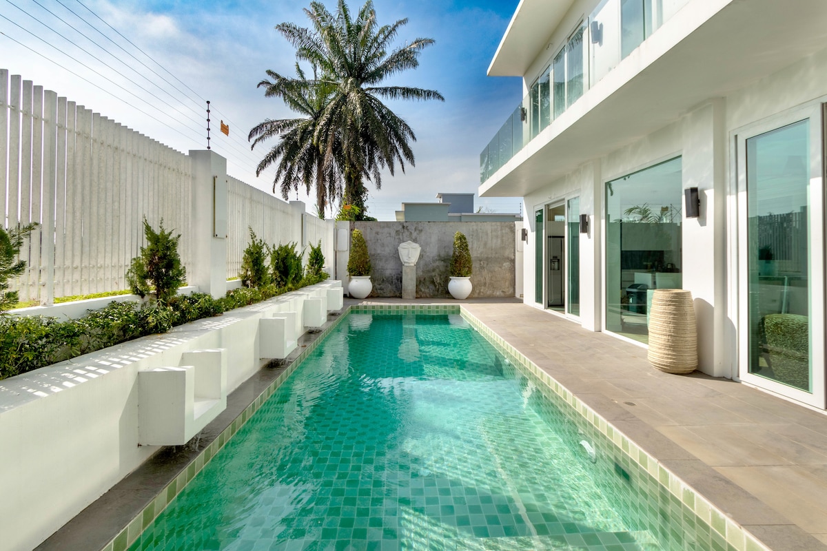 Experience modern island living in this stunning 3-story, 3 bedroom villa, perfectly located in Rawai. Featuring a pool and a spectacular seaview rooftop, this home is designed for relaxation and style. Open living areas filled with natural light, a full kitchen, and seamless indoor-outdoor flow to the pool. The rooftop offers breathtaking ocean views and is furnished with a covered lounge/ dining area, synthetic grass area with a huge reclining sun lounge and beanbags.