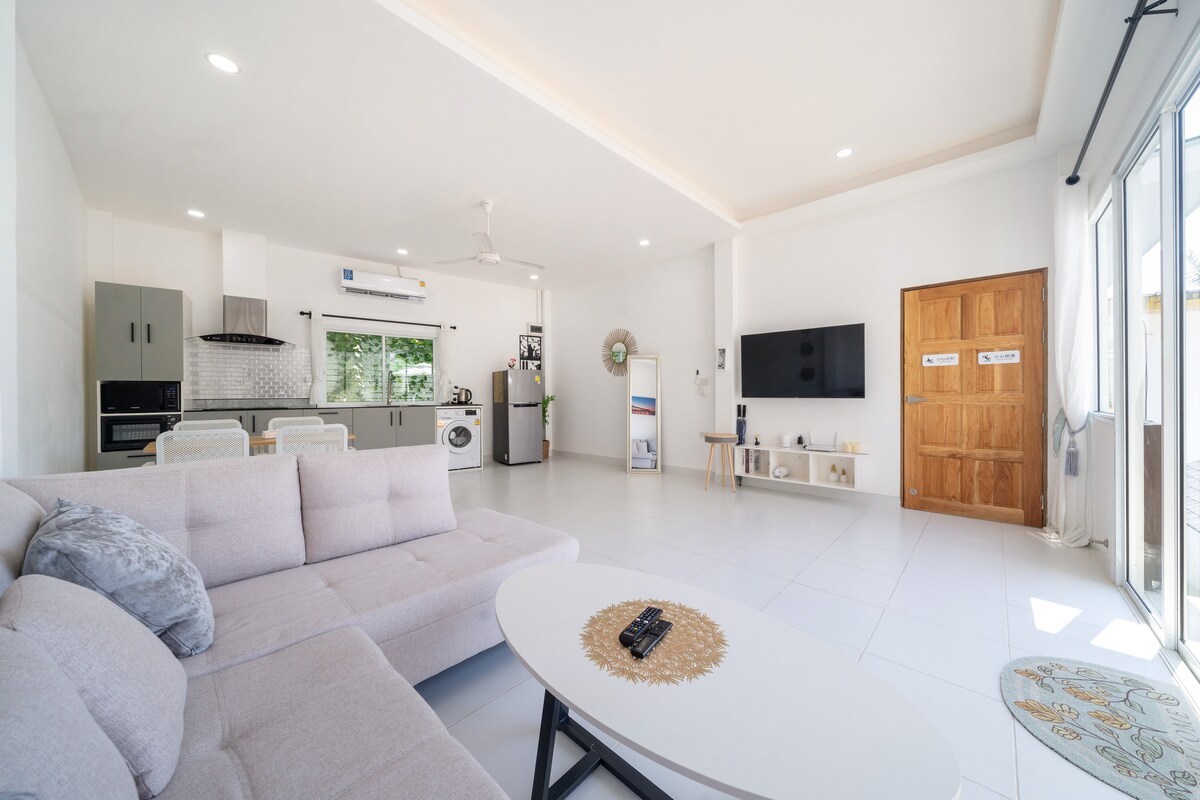 Perfect place for a family looking to spend their Phuket vacation right by Kata Beach. The house's modern kitchen is equipped with a dishwasher, stove, oven and all the kitchenware you need to cook. The house has a large dining table and an open outdoor and indoor living area. This house offers a great view overlooking the valley and sea bellow. There is a dishwasher and BBQ. The beach is 1.5km away, there is a big grocery store 500m away and also many restaurants in the kata area.
