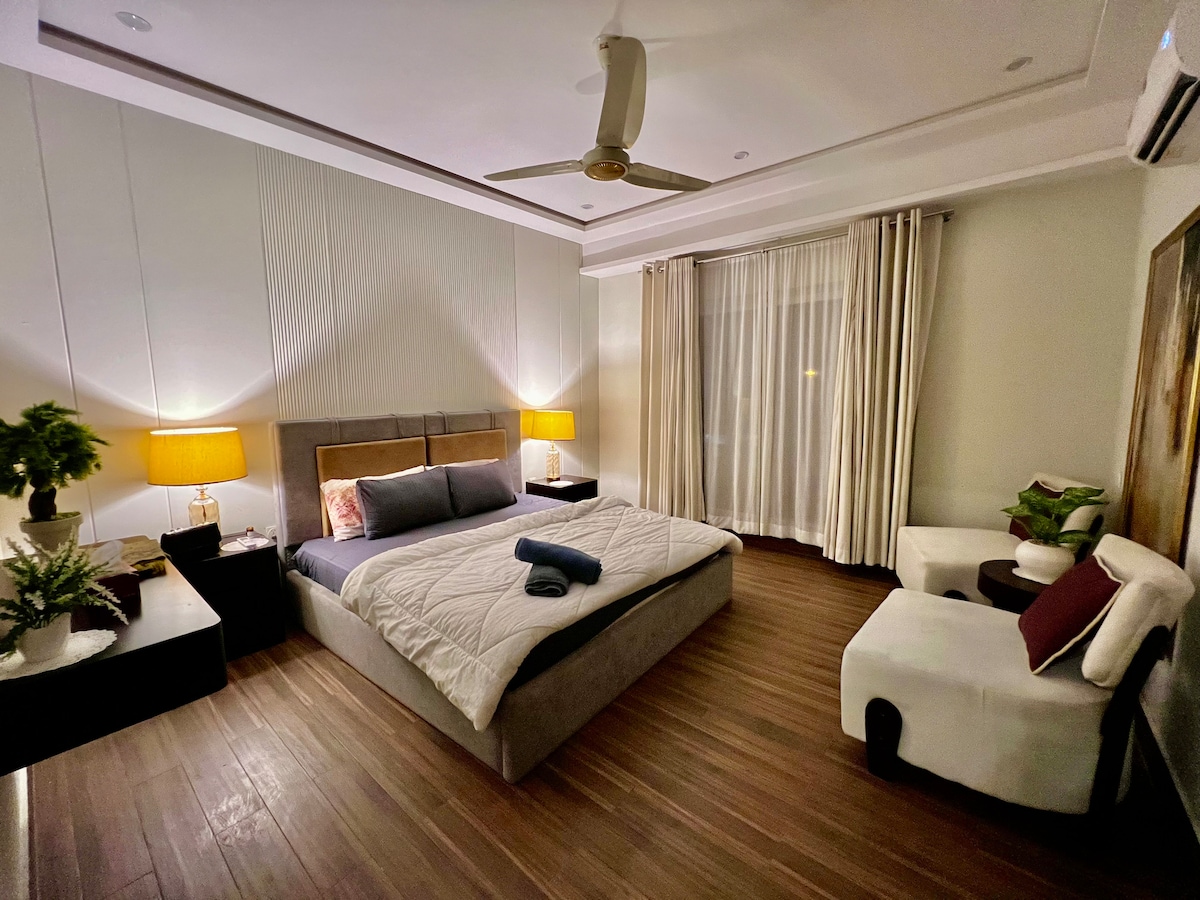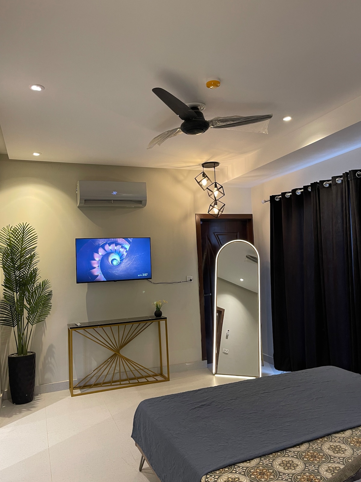 Step into luxury at our beautifully designer-decorated apartment, ideally situated on the 5th floor of a stunning building in Bahria Town Phase 8, Rawalpindi/Islamabad. A speedy lift ensures effortless access to your elevated retreat. Wake up to majestic, panoramic views that stretch across the city, all while enjoying the best value in the twin cities. Your comfort is our priority: the apartment is fully equipped with efficient AC, a spacious refrigerator, microwave, and a 4K LCD with Netflix.