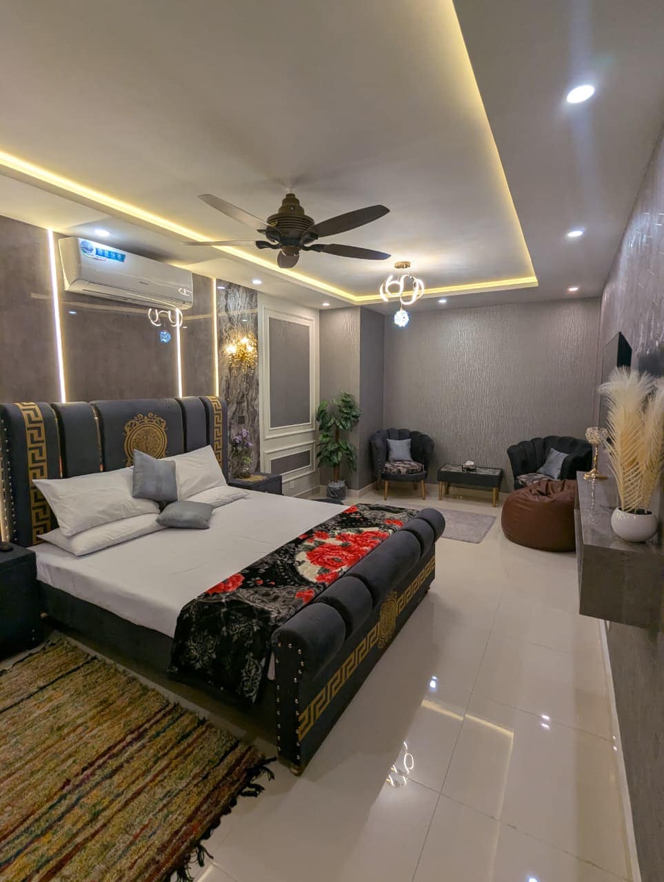 • Modern & Stylish: A contemporary bedroom with a focus on comfort and design. • Comfortable Bed: Features a bed with a light-colored, upholstered headboard and a crisp white bedspread. • Nightstand Details: Two matching nightstands, each with a lamp and decorative accents. • Elegant Backdrop: Set against a textured marble-effect wall, adding a touch of luxury. • Air Conditioned: Equipped with air conditioning for your comfort.