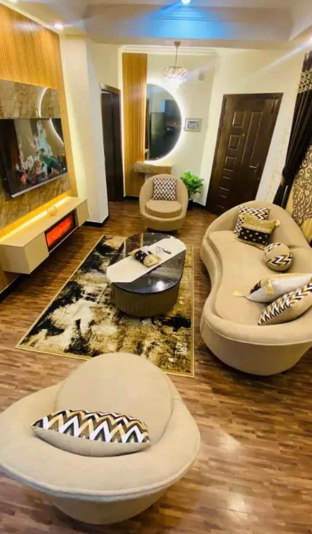 A spacious one Bed apartment King size bed Massage chair Pool table Sheesha for Sheesha lover Massive fire place 65” LED Sound system Netflix and chill Complementary snacks and drinks Bathroom amenities Fully equipped kitchen Heating and cooling system Free of cost cleaning services during the longer stays Scenic view from the terrace Assistance with the luggage available Self checkin available Staff available in the building till 9pm for assistance and to make your stay comfortable