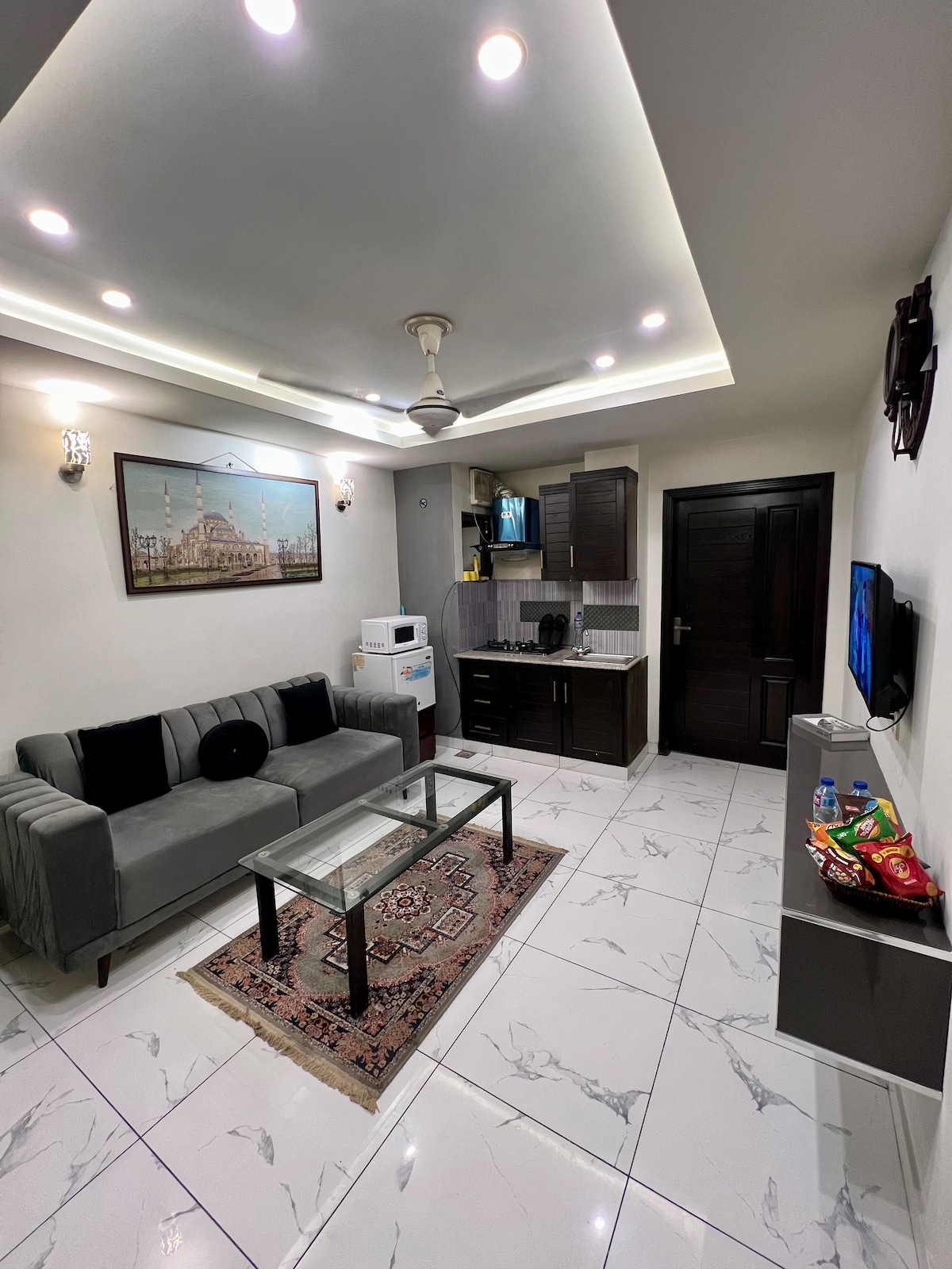 Discover our cozy one-bedroom apartment, perfectly located in the heart of Islamabad. Ideal for Families, couples, solo travelers, or business professionals, this stylish space offers comfort and convenience for your stay. ► Modern interiors: spacious bedroom, sleek kitchen, cozy living area. ► Building features Coffee Beans & Brim – dine-in or takeaway!. ► Amenities:High Speed Wi-fi, Free Parking, garden, 24/7 security. ► Family-friendly, centrally located – everything at your doorstep
