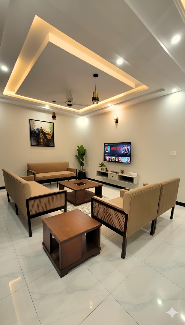 House features several private apartments, each with its own separate entrance and single-door access for complete privacy. Every apartment includes a lounge, an open kitchen, and a private balcony. The property is located close to the beautiful Margalla Hill, and it’s just a short drive from Islamabad city centre. Guests also have access to shared spaces like a spacious terrace and a cozy atrium seating area, perfect for relaxing or socializing. The house is fully secure, with CCTV surveillance