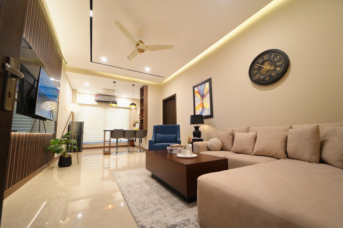 A 1700 sq. ft. 2-bedroom boutique apartment located in the serene heart of Bahria Town. Perched on an elevated floor, this thoughtfully curated home is bathed in natural light and offers both north and south-facing open views with shops and restaurants at just walking distance. Designed for comfort and elegance, it's ideal for families, couples, business travellers, or anyone seeking a peaceful yet well-connected stay in Islamabad.