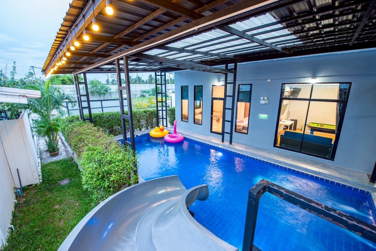 Paradise Estate, Pattaya We're the PERFECT country getaway: 9 bedrooms, a beautiful 18 meter pool, fitness center, BBQ, pool table, ping pong, darts, shuffleboard, badminton, volleyball, and football. Near to Lake Mabprachan (bicycling, jogging, restaurants and pubs), and only 1km from Chang Thai Thappraya Safari (ATVs, elephants, shooting, etc.). Animal Paradise Cafe adjacent (open 10am-10pm). Sauna, cold plunge, and jacuzzi extra, otherwise no extra charges, enjoy!