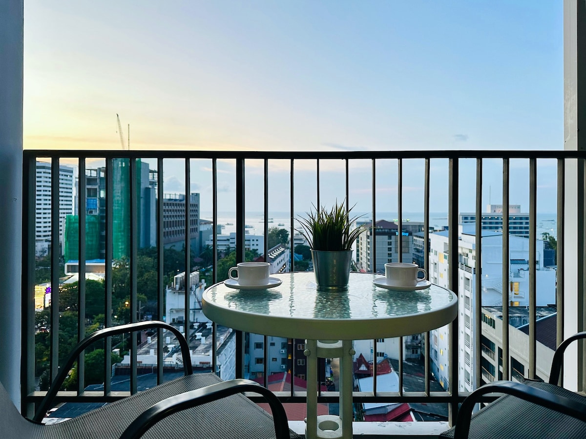 芭堤雅市中心正海景大两房公寓3大床大阳台,高层12楼正海景/芭堤雅湾景/距沙滩300米/近商场步行街