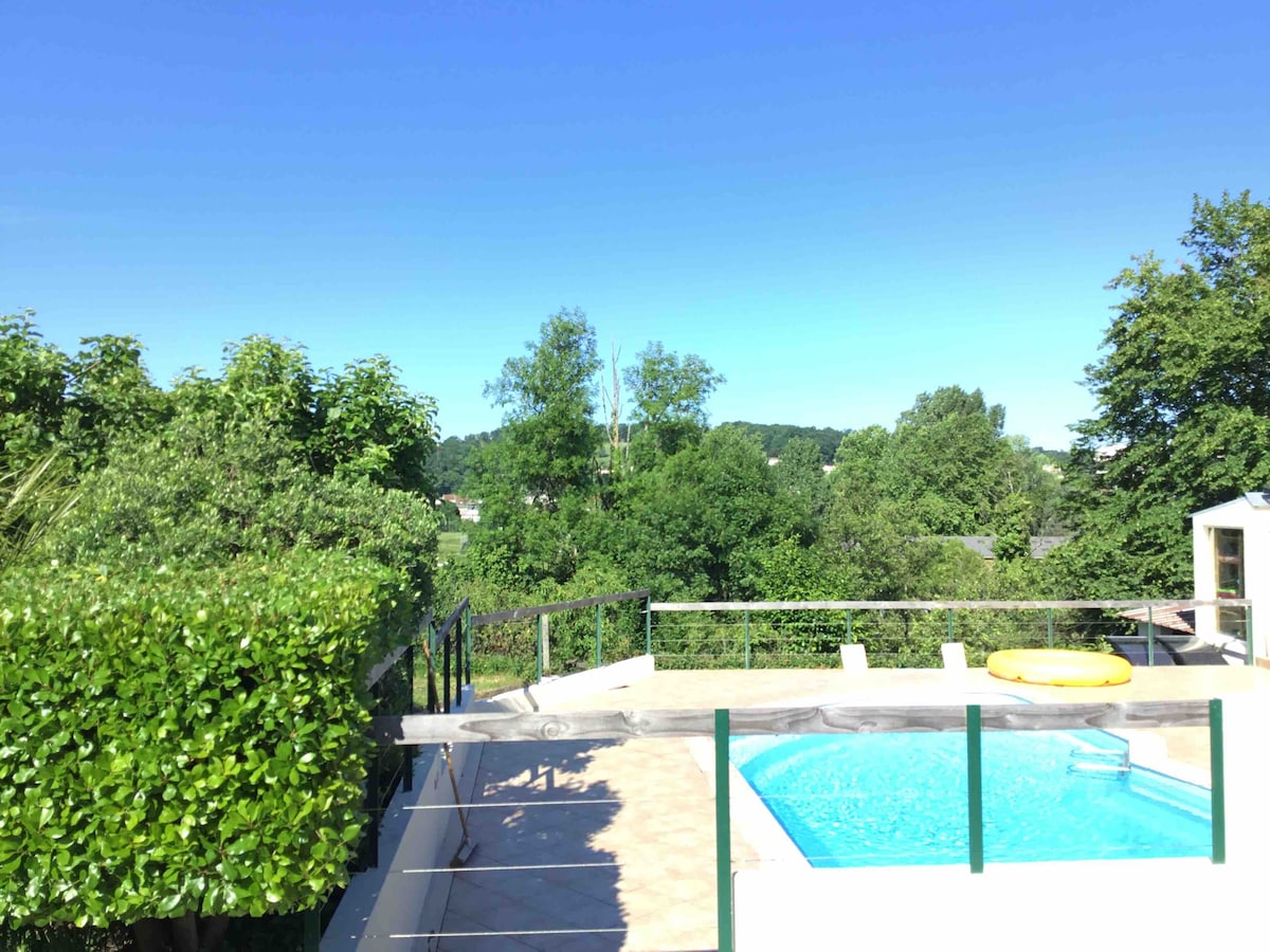 Charming loft/duplex (120 m2) in an old renovated farmhouse in the heart of Périgord-Dordogne. Settled on the top of a quite hill, surrounded by 10 ha with orchard, vegetable garden, meadows and woods overlooking the valley and village. Private outdoor areas. Wood heating. Saltwater overflow swimming pool (70 m2). High band internet. 30mn/Bergerac vineyards, 1hour/prehistoric sites (Lascaux). Easy access (10mn/highway, 1h/Bordeaux airport). Artist studio on request. Winter long term welcomed.