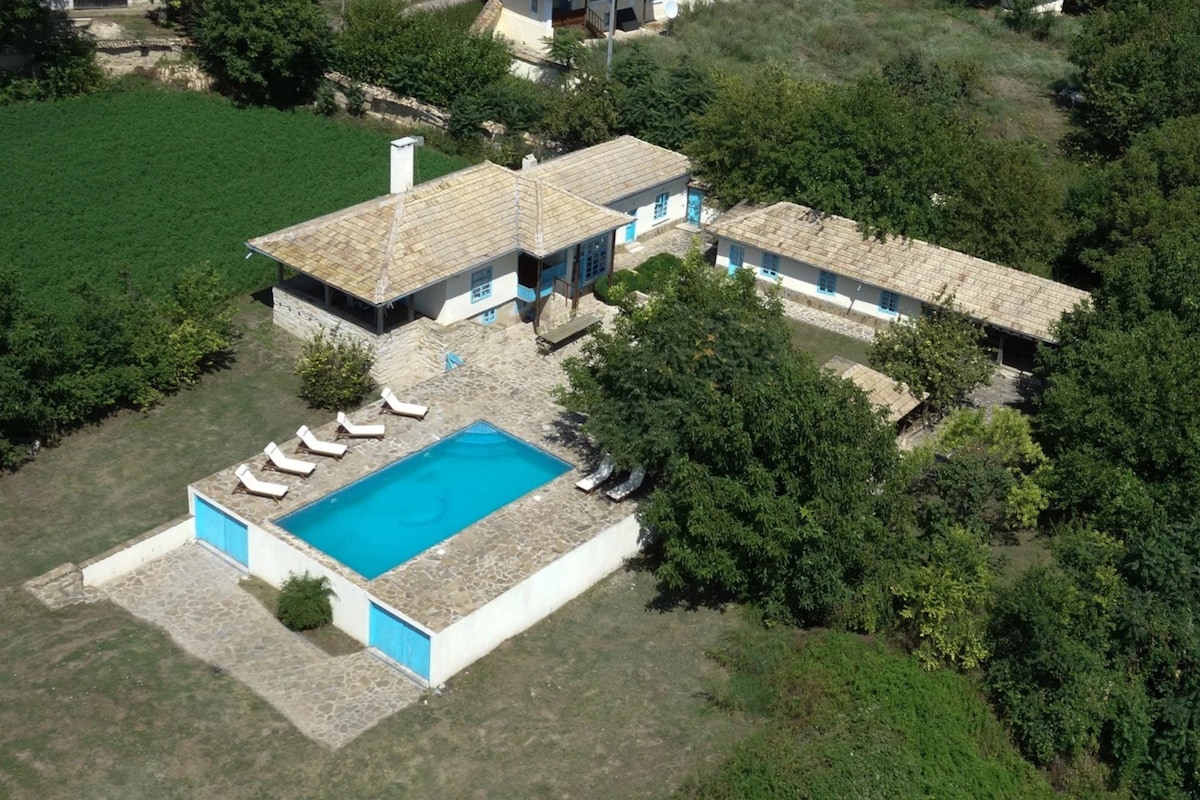 The picturesque house Botev 1 is located in the rural village of Mirovets in a gentle sloping landscape in the Nord-East of Bulgaria. It makes part of a whole of 3 houses standing on a private property of about 1 ha. The house has its own privacy and has been refurbished in traditional Bulgarian style with modern conveniences, among which a swimming pool. Ideal to leave your daily stress behind and enjoy a glorious "dolce far niente".