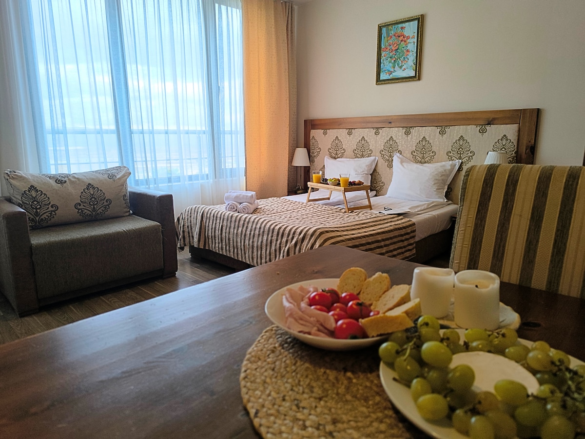Our studio offers you everything you need for a relaxing stay. It features a fully equipped kitchen, a bathroom with a bathtub, and a bedroom area separated by blinds for privacy. The living area includes a comfortable sofa bed, perfect for two children or adults. Enjoy more amenities such as air conditioning, private Wi-Fi**, a smart TV and 130 cable channels. Start your day at the bar table with a cup of coffee while watching the sunrise over the mountain—a perfect way to begin your day.