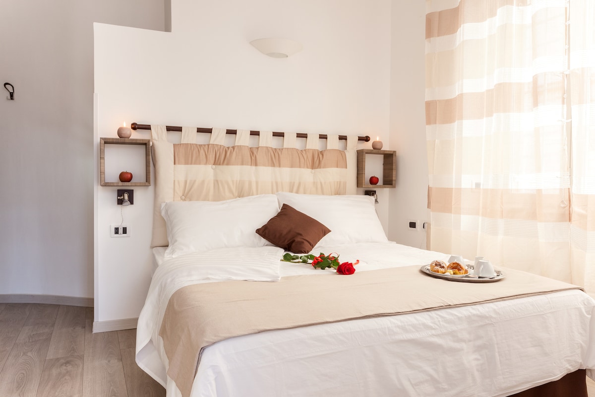 Le confortevoli camere matrimoniali large sono dotate di bagno privato, smart-TV, WIFI, mini-frigorifero, scrivania, asciugacapelli, condizionatore, kit cortesia di saponi, asciugamani di tre misure, biancheria da letto in cotone e soprattutto vasca idromassaggio.