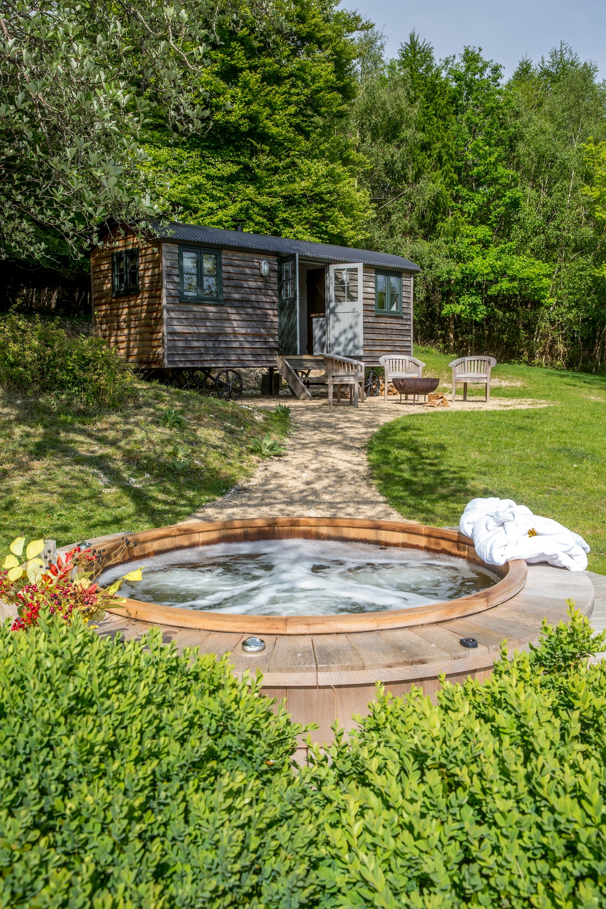 'Brambling' shepherd's hut is nestled in the peaceful surroundings of Summerdown Estate. One of a small cluster of four cosy shepherd's huts, ready for you to relax and unwind, surrounded by nature. A stay at Brambling hut includes the exclusive use of: Wood-fired hot tub in its own private outdoor setting. Outdoor seating, firepit and BBQ it’s a beautiful spot to rest and relax. Wood burner & cosy interior Secluded setting in rural Hampshire Perfect for couples & special occasions
