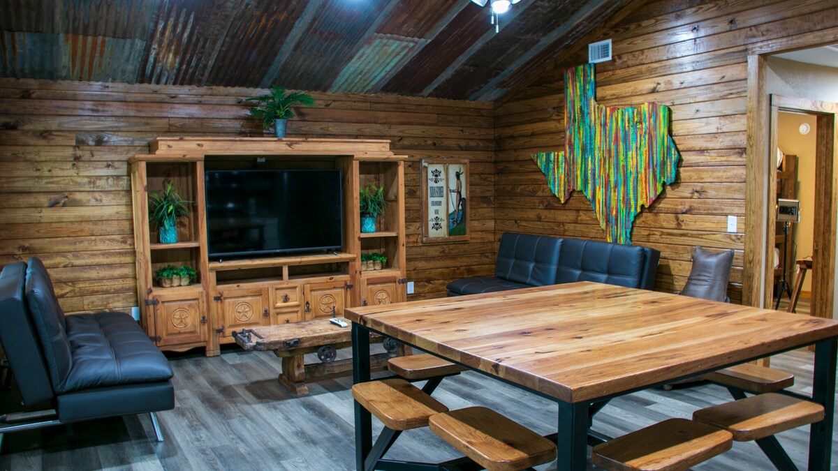 Escape to our studio-style Bunkhouse Cabin, perfect for up to 8 guests with two queen beds and two full beds. Enjoy a fully equipped kitchen, cozy living area, and communal fire pit for evening gatherings. Located just half a mile from the Bent Rim Bar and Grill, the official stop of the Three Twisted Sisters, you’ll love the convenience and local dining. Explore the nearby Frio River and Garner State Park. Free coffee included! Book your stay today for a memorable Texas Hill Country adventure!