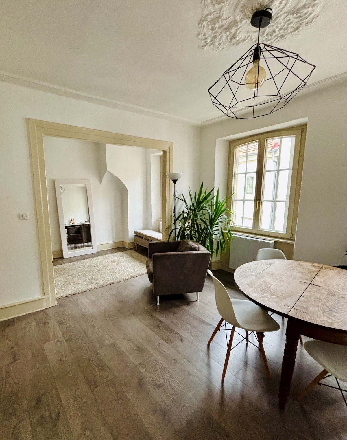 Charmant petit studio tout équipé, idéalement implanté en cœur de ville, proche de tous commerces et facilités (tramway à moins de 100m) Parfait pour une halte en amoureux, comme pour une étape de travail, Ambiance cosy et vivante dans un immeuble chargé d'histoire : au départ siège d'une banque, puis magasin de papiers peints, et enfin agence immobilière... C'est dans un morceau d'histoire du quartier que vous logez !
