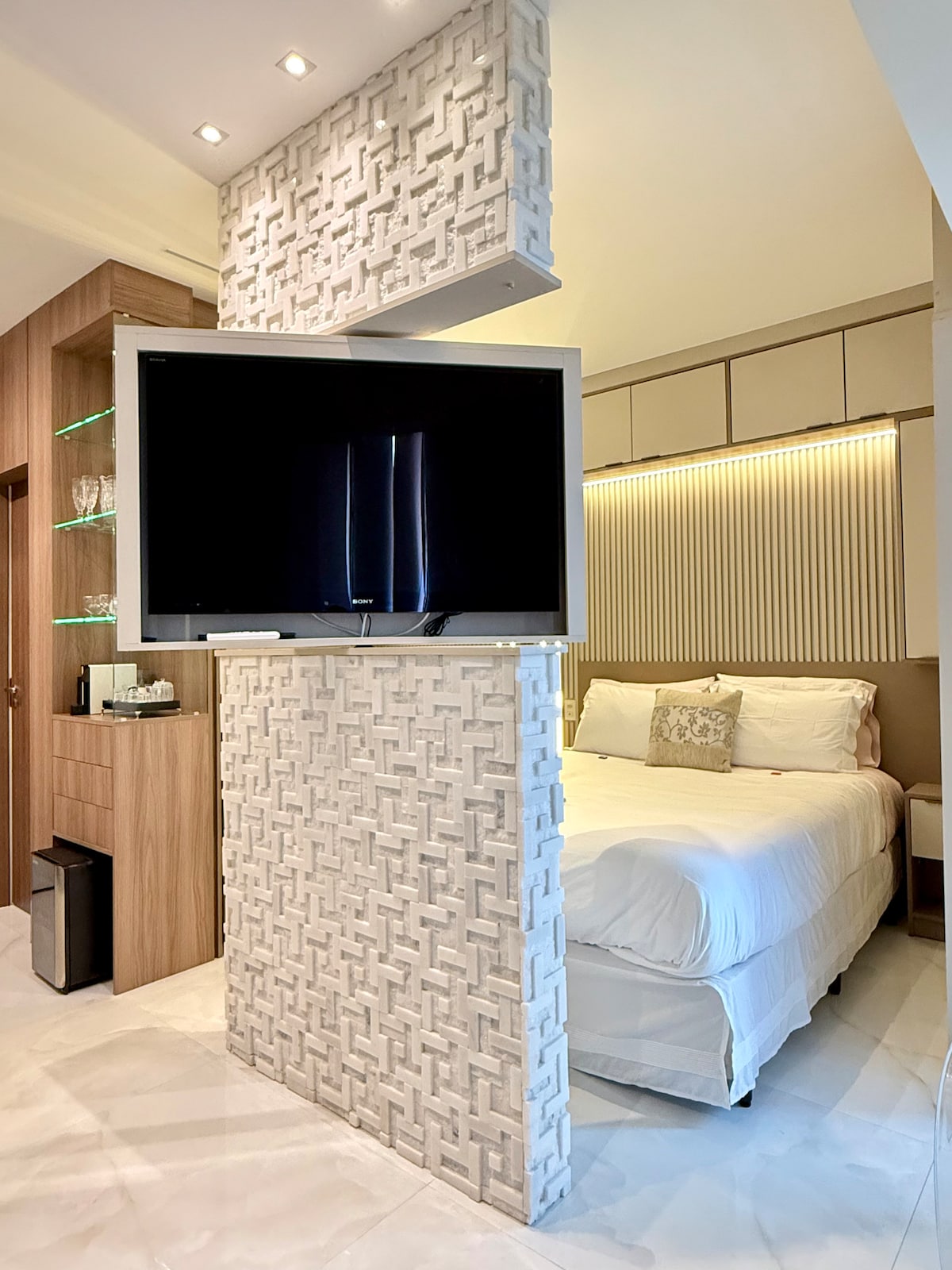 Experience One Eleven in Vila Olimpia. This modern apartment features large windows with breathtaking city views and natural light. The unit boasts 600 Mbps internet and a 4K HD TV. For total comfort, it has a Hot/Cold AC system: 27,000 BTU/h unit in the living room and 10,000 BTU/h in the bedroom. The bedroom is quiet and dark for a restful sleep. Impeccably maintained, you’ll be walking distance to top restaurants and business hubs—a safe, upscale retreat with a stunning urban backdrop.