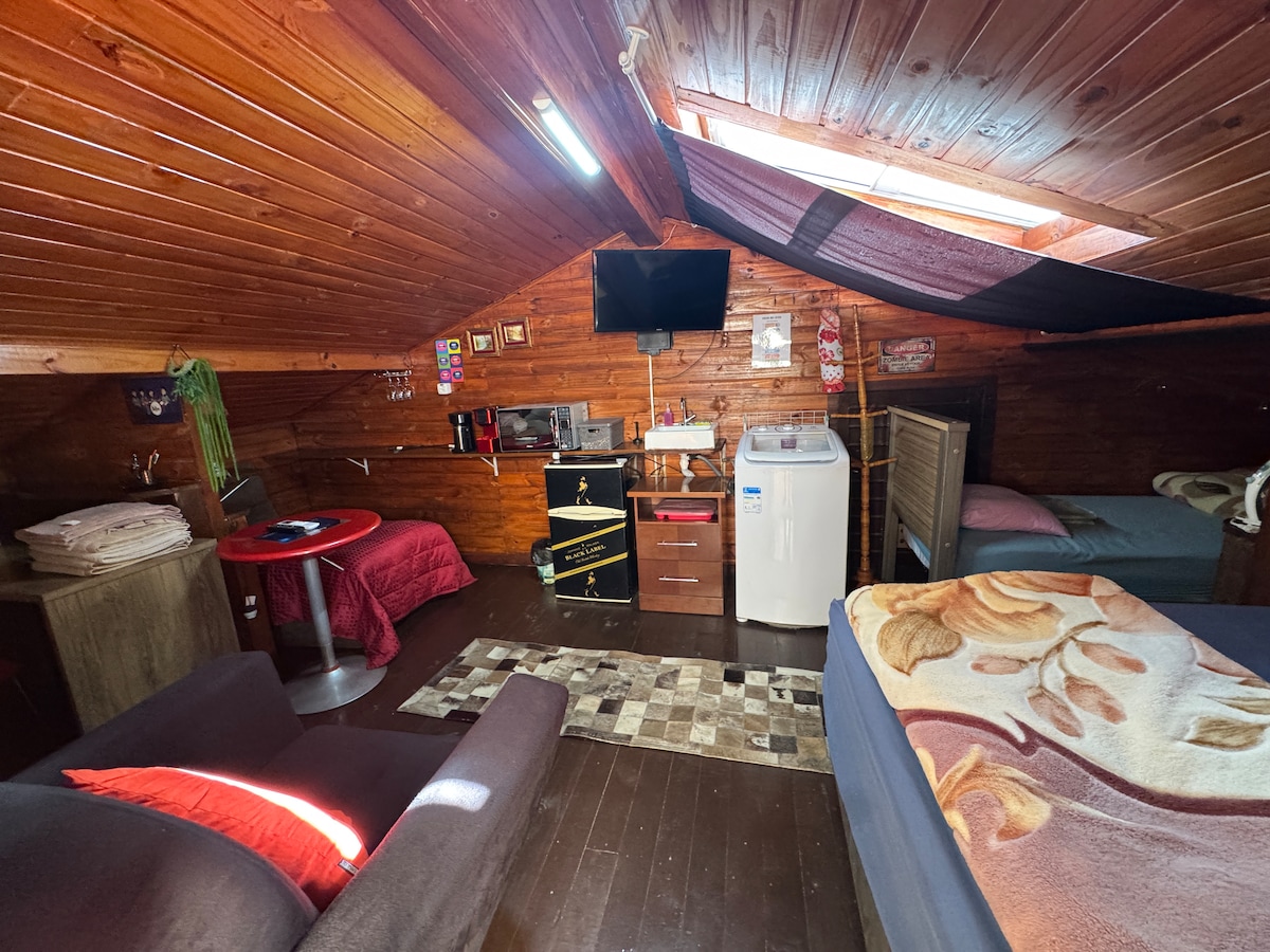 Se você busca um cantinho único, acolhedor e cheio de charme, acaba de encontrar! Este ático de 35m² é um verdadeiro refúgio no topo da casa — um espaço compacto, funcional e revestido inteiramente em madeira, que exala conforto e aconchego em cada detalhe. Com uma janela no telhado que deixa a luz natural entrar suavemente, o ambiente é perfeito para relaxar ou trabalhar com tranquilidade. A decoração é minimalista e acolhedora, ideal tanto para casais quanto para viajantes solo e mochileiros.