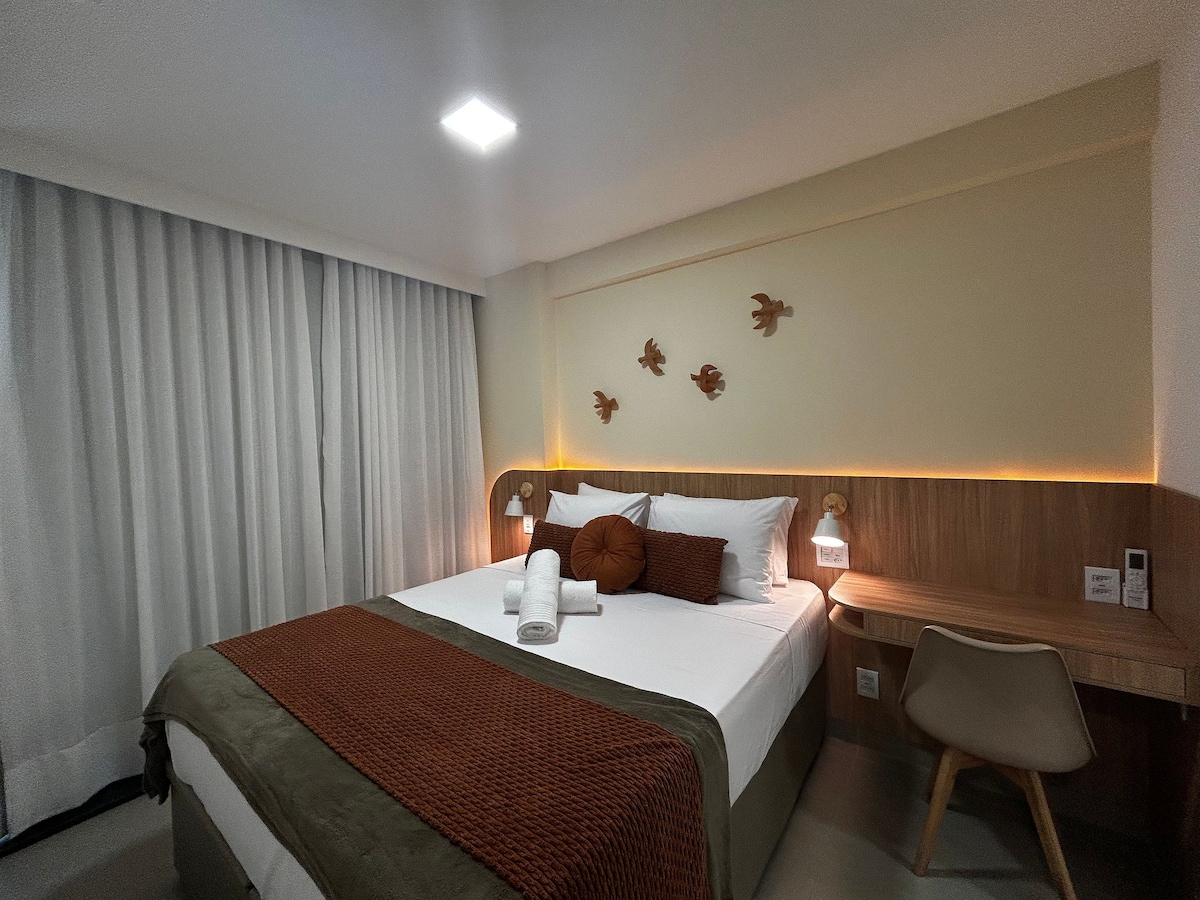 Modern, comfortable and functional studio, ideal for couples, business trips, or tourism. Well-designed space with contemporary style, custom cabinetry, and excellent lighting. Features a hotel-style bed, quality linens, air conditioning, fast Wi-Fi, TV, and a sofa bed, providing comfort for rest or remote work. Fully equipped integrated kitchen with refrigerator, cooktop, microwave, coffee maker, utensils, and a functional countertop