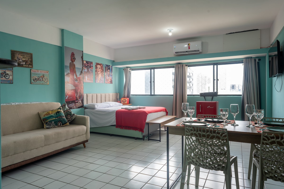 IMPORTANTE: Situado a beira mar, em um edf. antigo e simples, icônico, marco da arquitetura moderna Pernambucana. A água do prédio é proveniente de poço artesiano, pode apresentar uma coloração amarelada. Microloft confortável, decorado e equipado, ideal para casais. Possui uma cozinha compacta, com micro-ondas, cafeteiras, chapa elétrica e geladeira. TV (sem streaming). O edf. não tem estacionamento e local para guardar bagagens. Indico os Shoppings Recife e Riomar com locks gratuitos.
