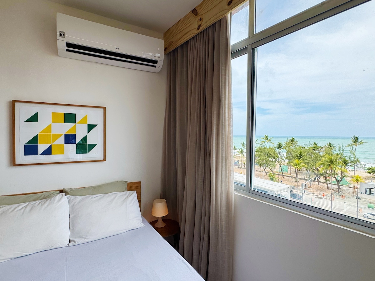 Apartamento localizado na 2a quadra da praia de Boa Viagem com vista para o mar, a 50m da praia . À 4 km do aeroporto. Essa acomodação oferece uma suite com cama de casal e outro dormitório com 2 camas de solteiro, WC social, sala com mesa de jantar, TV de 43' e Wifi de 600 mega, cozinha completa e lavanderia. Todos os quartos com ar condicionado Split. Temos roupas de cama, banho e mantas. Não tem toalhas de praia. Perto de padarias, supermercados, restaurantes, bares, academia, farmácias.