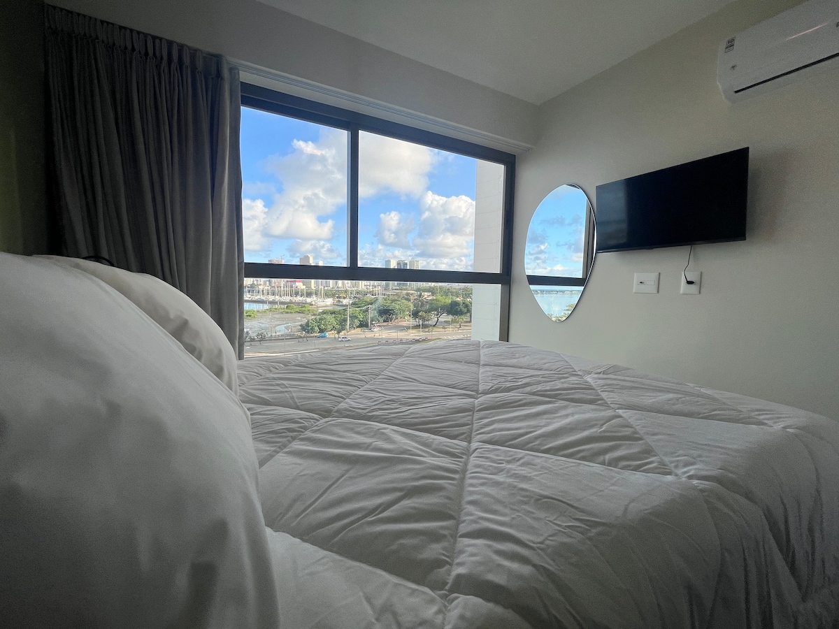 Flat Moderno no Edifício Parque do Cais - Recife Flat na Av. Eng. José Estelita, São José: sala climatizada c/ smart TV e sofá-cama, cozinha americana completa, suíte, internet e eletrodomésticos novos. Vista do Recife antigo e moderno, garagem grátis, perto de pontos turísticos, shopping e praia. Inclui lavanderia, sauna, academia, piscina, coworking e mercado na recepção 24 h. Preço justo. Entre em contato conosco!