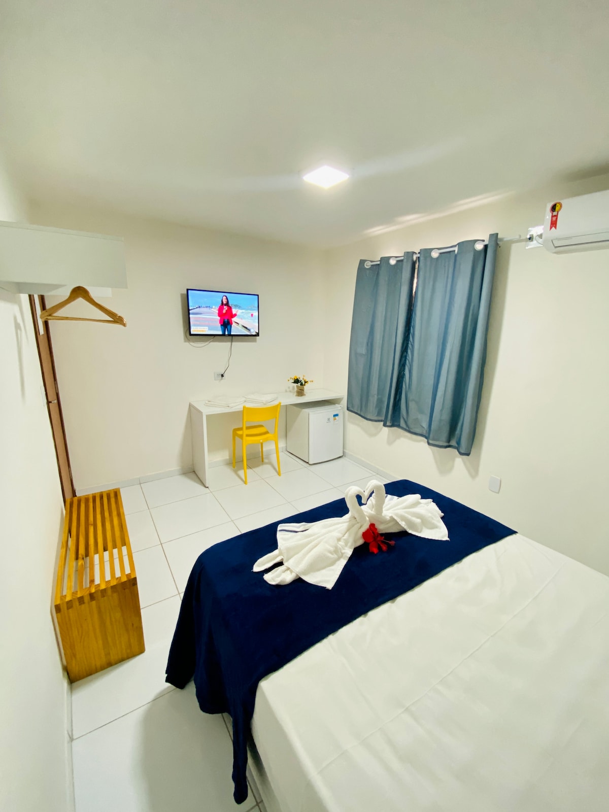 Suites com cama, ar-condicionado, frigobar, banheiro privativo com ducha quente, Wi-Fi e TV.