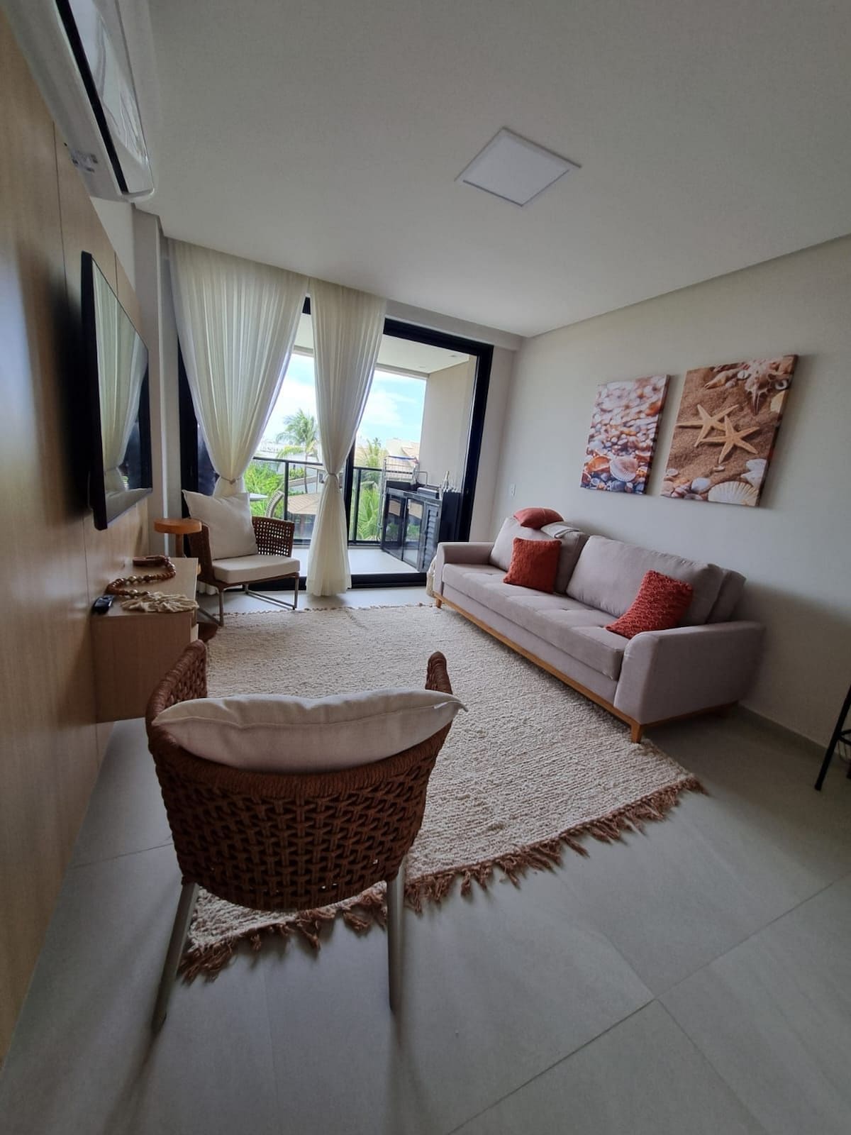 A apenas 20 passos da praia e a 9 minutos a pé do vibrante Centrinho de Porto de Galinhas, nosso Flat é o seu refúgio perfeito à Beira-mar. Desfrute da proximidade com a famosa Rua das Sombrinhas e a Feira de Artesanato, com todo o conforto e estilo que você merece. Relaxe na Rede da sua Varanda Privativa, contemplando a vista das Piscinas Naturais. O nosso espaço foi pensado para o seu Máximo Conforto. Sala de estar convida ao descanso no Sofá cama e uma Smart TV 55", equipada ao Prime Vídeo.