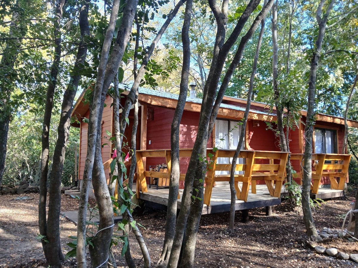 Ven a disfrutar de un lugar tranquilo, rodéate de naturaleza, de árboles nativos, en un lugar acogedor, con calefacción a leña, quincho para hacer fogata y todas las comodidades para disfrutar junto a la familia y amigos. Hemos incluido WIFI y TV para que no falte nada! Cuenta con una cama matrimonial, dos camas de 1,5 plazas y litera con 2 camas de 1 plaza, microondas, cocina con horno, refrigerador, dos terrazas con techo, tinaja (tiene costo adicional), parrilla para asados y mucho más!!