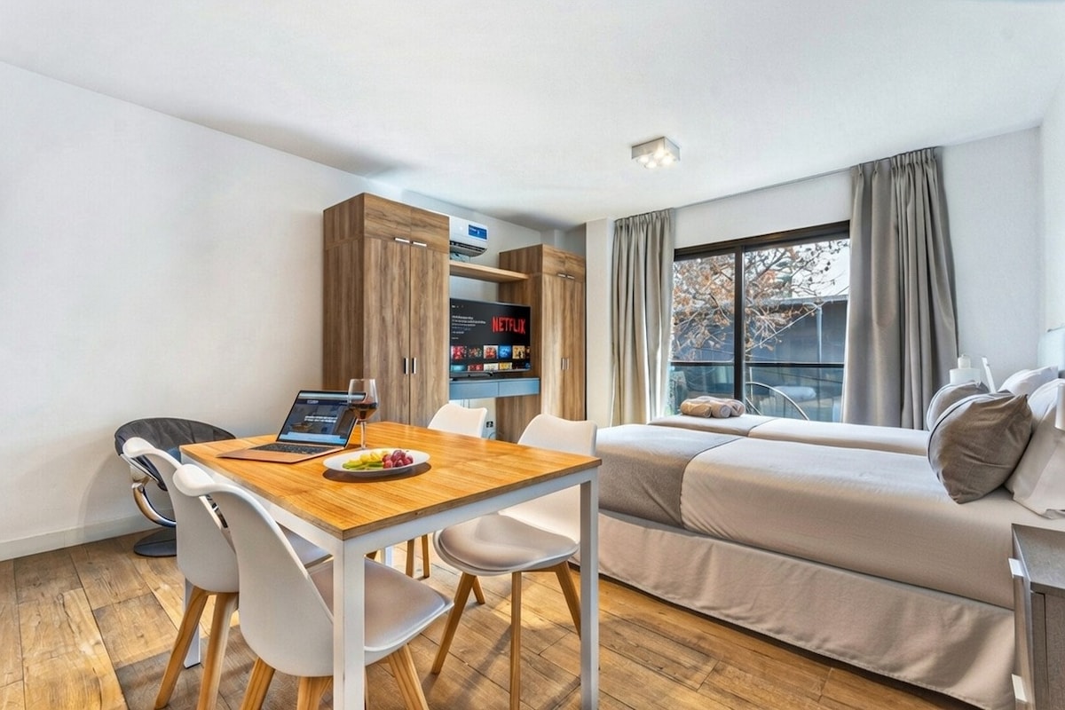 Beautiful brand new studio, fully furnished with excellent quality equipment -TV 32' with cable/Netflix, WIFI 100 MB, A/C hot-cold, King Size bed, desk, full kitchen, -in a Hotel style building with 24 Hs security, swimming pool, Gym, laundry. Located in the heart of Palermo Soho: 200 mts. from subway D/Plaza Italia (Santa Fe Av.), close to stores, bars, restaurants, shopping malls, parks, museums and with easy access to downtown and many touristic spots!