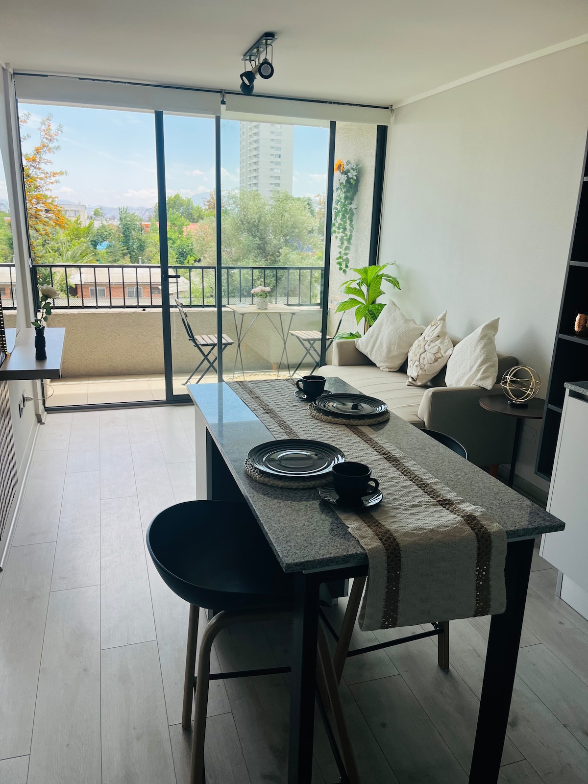 Cozy and harmonious minimal style apartment fully equipped for 4 people, Wi-Fi, 24 hrs autonomous entrance and concierge, private parking, common areas and services included. Excellent location! Safe neighborhood, one block from the Santa Isabel metro, walking distances to Barrio Italia, Providencia, Santa Lucía hill, San Cristóbal hill and Plaza Italia (Plaza Dignidad). Close to banks, ATMs, supermarkets, warehouses, bakeries, cake shops, cafes, pubs and restaurants.
