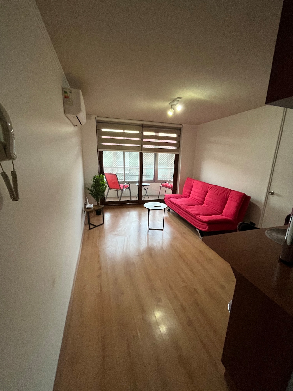 Luminoso departamento, bien equipado con piso flotante en living y dormitorio. El dormitorio tiene cama Box Spring de 2 plazas, impecables sabanas, tiene un Smart Tv led cuenta con Netflix , internet via wifi. La cocina cuenta con refrigerador, horno eléctrico, microondas, tostador, ollas y utensilios de cocina para cocinar. Tiene loza y cuchillería completa. Si esta mas de 6 noches dejo sabanas de recambio. El balcón cuenta con una terraza con mesa y 2 sillas.