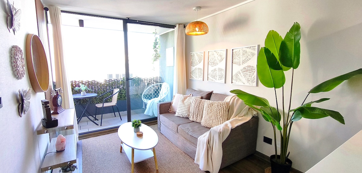 Moderno departamento con hermosa vista a la cordillera 🤍 Ubicado en sector céntrico y tranquilo, a una cuadra del metro Conchalí, a 15 min del aeropuerto, 10 min del centro de Santiago y a menos de 5 min caminando del Hipódromo Chile y Estadio Santa Laura. 1 habitación + sofá cama en el living Cocina equipada Baño privado Balcón con vista a la cordillera WiFi y TV con aplicaciones Completamente equipado Moderno, cómodo y minimalista Piscina, gimnasio, quincho, co-work y salón de eventos