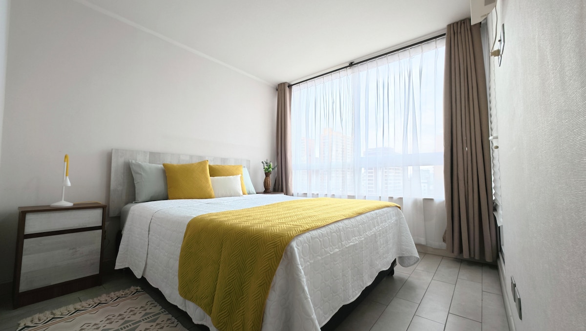 Departamento recién remodelado en el corazón de Santiago. Se caracteriza por un diseño simple y práctico. El espacio cuenta con 2 dormitorios, en edificio seguro y muy céntrico. Desde el edificio puedes caminar a distintas atracciones turísticas, como el Cerro San Cristóbal, Barrio Bellavista, Centro de Santiago, a pasos de la estación de metro Cerro Blanco, restaurantes y supermercados. El depto posee toallas y sábanas de excelente calidad No se permiten mascotas NO se permite fumar