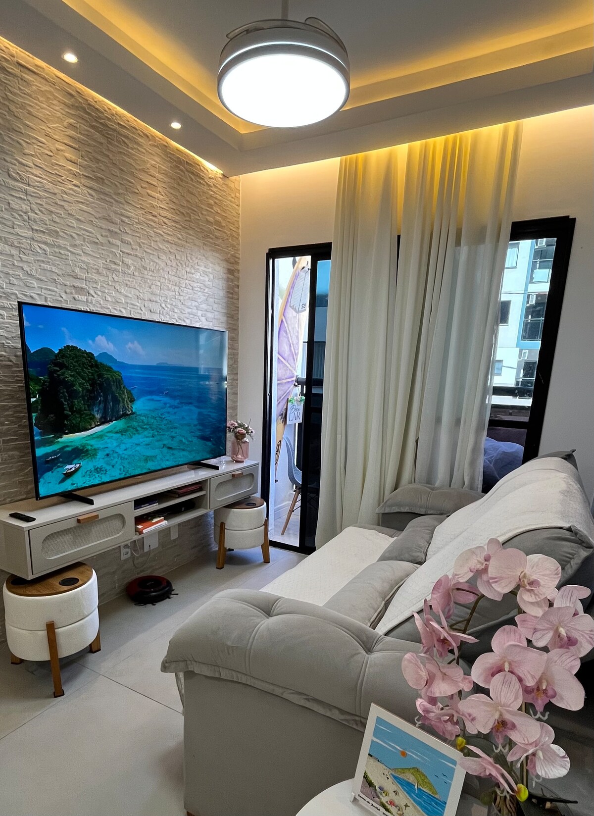 Amplo Apto de 54 m, novo e muito bem equipado, 7 min da Prainha. Quase em frete ao Recreio Shopping e à estação do BRT. Com ar condicionado e Tv com Box Tv com vários canais, séries e filmes na sala. No quarto, ar condicionado e Tv com Chromecast. Ampla varanda com vista para a piscina e montanhas. Internet de alta velocidade para suas reuniões de trabalho e entretenimento. Garagem, piscina aquecida, espaço kids e minimercado. Aproveite a praia e tudo mais que o Recreio tem para oferecer.