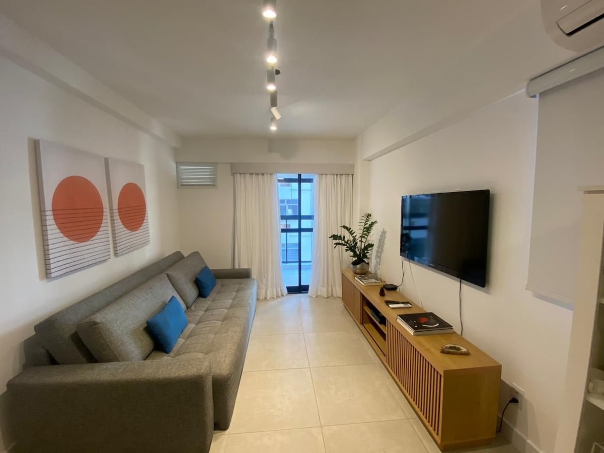 Boho chic style apartment, on the Copacabana beach! - Queen bed, sofa bed, dining table, air conditioning and space for home office (Wifi 300Mbps). Kitchen with stove, refrigerator, oven, microwave, blender, coffee maker, juicer, sandwich maker, pans, kitchen utensils, various books, guitar and TV with apps. - Market and pharmacy under the building, restaurants and shops around the apartment. - Airport at 8.3km - Cristo Redentor at 11.5km - Pão de Açúcar at 2.8km