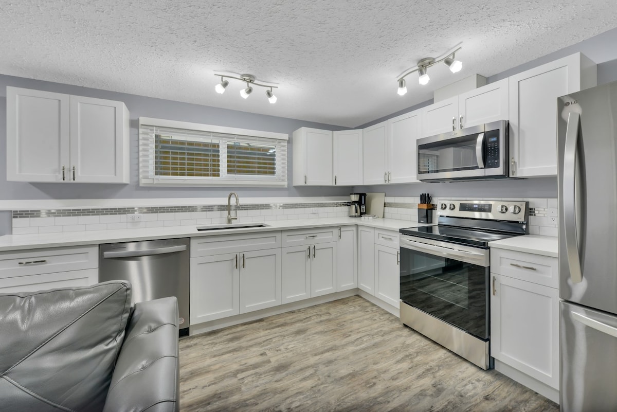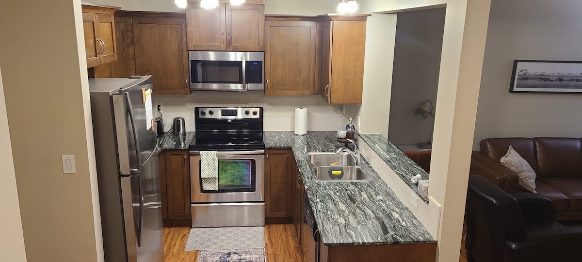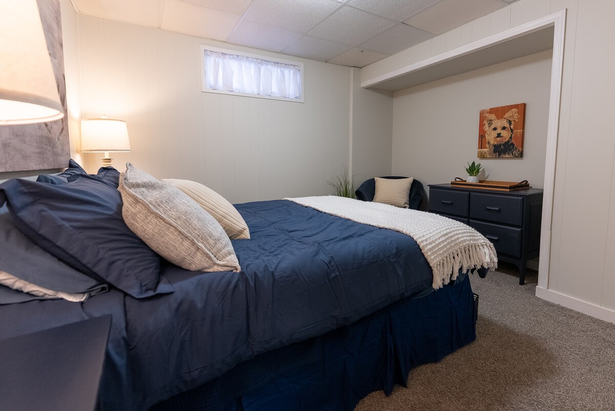 Find your stay at the Hidden Gem! A unique, peaceful basement hideaway with all the themed charm of a beautiful mountain cabin. Enjoy the luxury of a King bed in the primary bedroom, or stay in the cabin-themed second queen bedroom. In the spacious living room, cozy up on the recliner sectional in front of the electric fireplace & 50” TV. Start your day at the coffee bar, prepare meals in a fully equipped kitchenette & end your day relaxing in the 6-foot soaker tub!