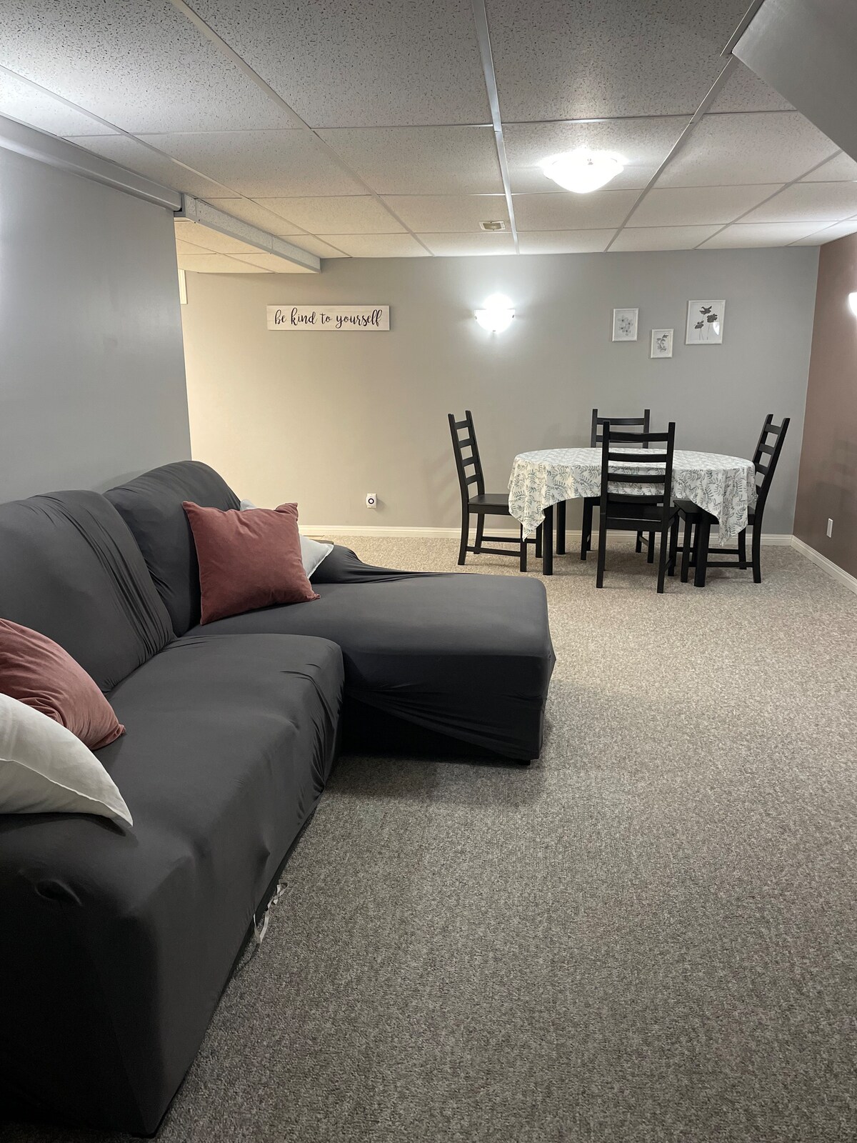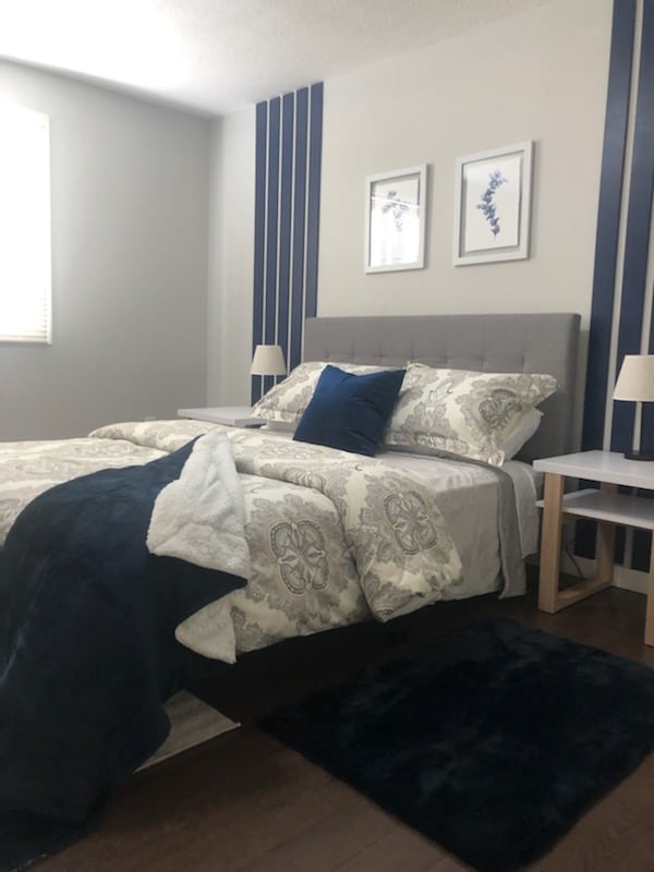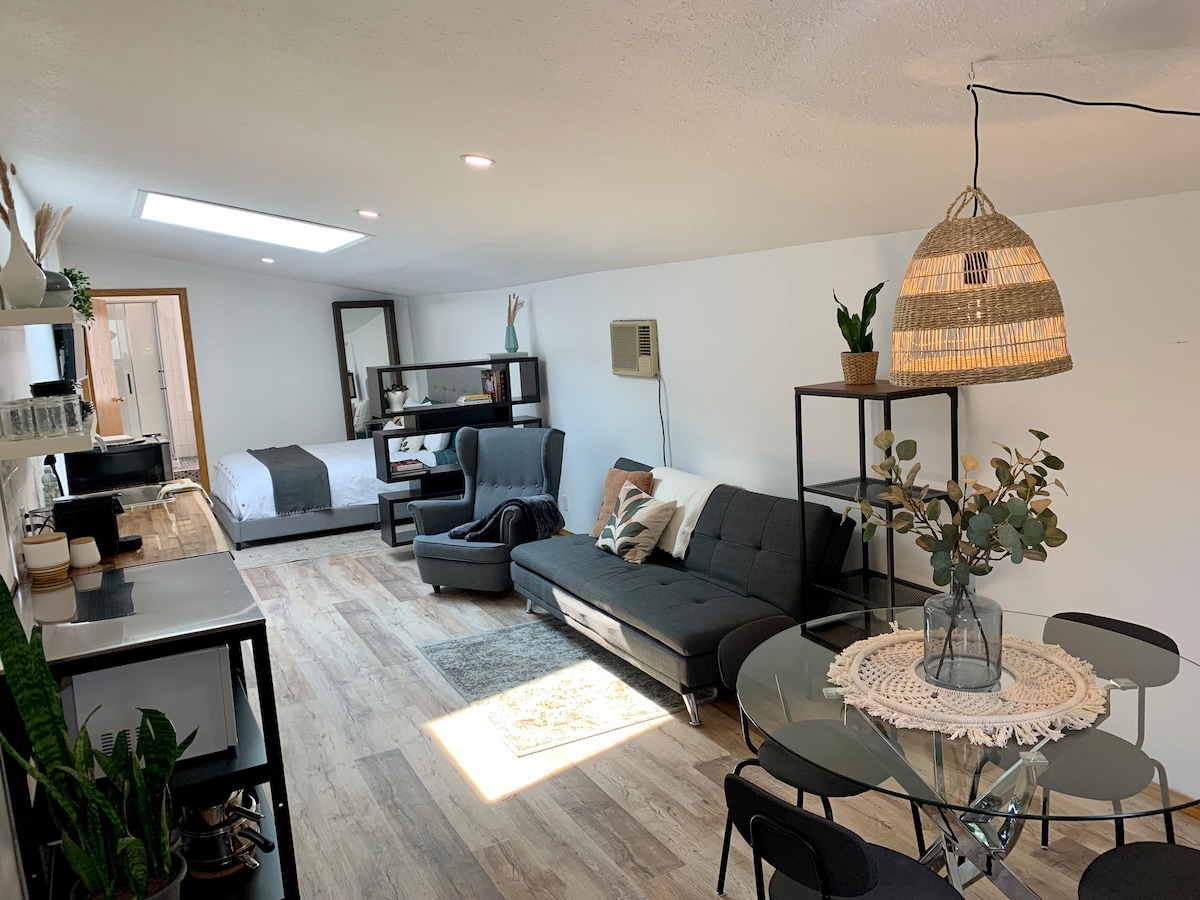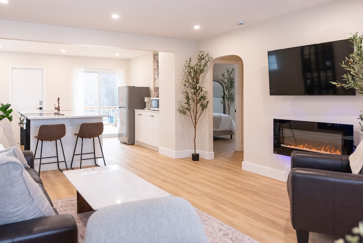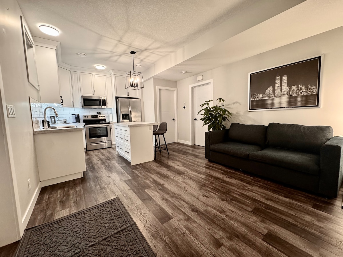 KING SUITE***Cozy 1-bedroom king suite- completely separate entrance, new build construction with private yard and cement patio, off-street parking with a plug-in for winter season. Features a king bed w/blackout blinds & queen sofa bed with luxury duvet beddings, full kitchen and washer/dryer. Enjoy in-floor heating throughout and 9-foot ceilings, creating a bright comfortable space perfect for privacy and relaxation. **** some days there is potential for noise transfer from the main dwelling