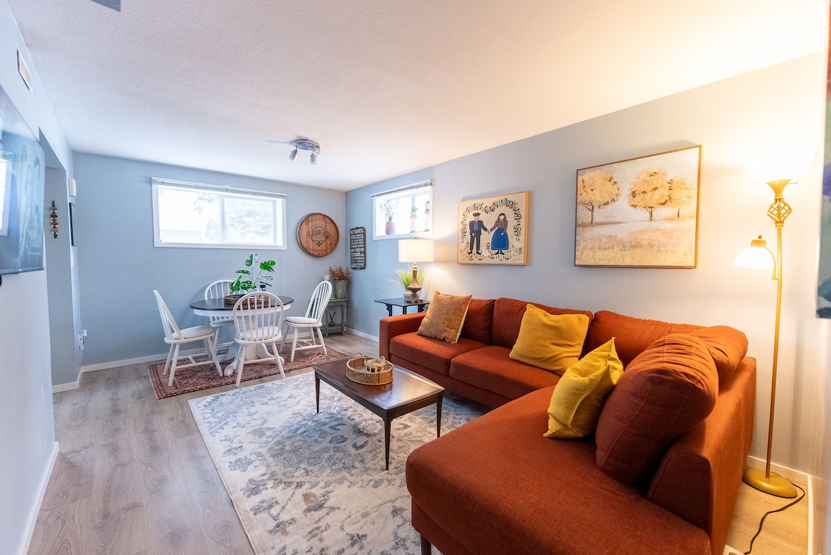 Kick back & relax in our beautiful guest suite, perfect for couples and business travelers. Attached to our family home, this cozy studio suite features a queen bed, versatile futon, functional kitchenette & private laundry. Enjoy the beautiful skylight that fills the space with natural light. Minutes from Red Deer’s beautiful walking trails and only 7 minutes to Highway 2. Book your stay today at our Sunny Studio Suite!