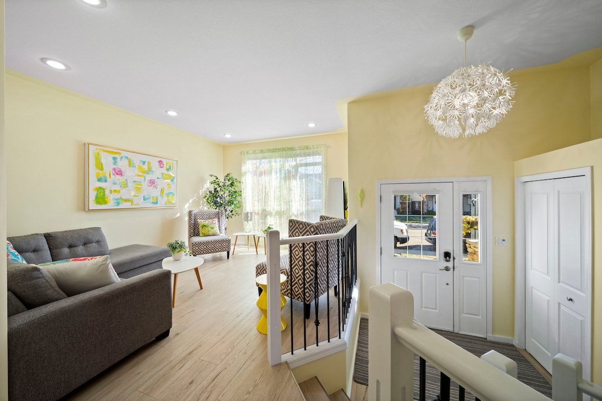 Perfect for the whole family or large groups! Welcome to our colourful & spacious home located in the beautiful neighbourhood of Inglewood! ✔ Pristine, bi-level with fun, vibrant design & decor & AC ✔4 Bed/ 3 bath -2 kings/2 Queens ✔ Hot Tub ✔ Walkout Furnished Basement ✔ Kids playroom ✔ Fully equipped kitchen ✔ InSuite Laundry ✔ Yard/Patio ✔ Fast Wi-Fi & 3 Tv's ✔ 2 car detached garage ✔ Self-check-in ✔ South RD - Close to shopping, Centrium, Servus Arena, RDP, hospital ✔ Great for long stays