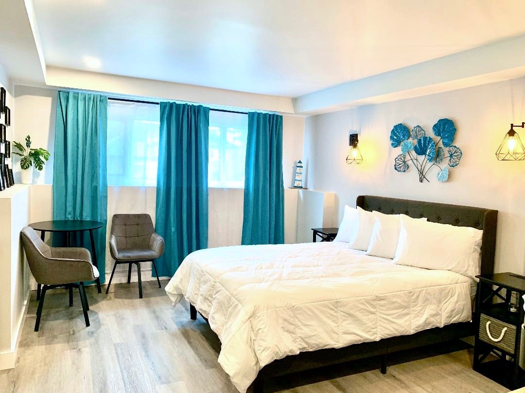 KING SUITE***Cozy 1-bedroom king suite- completely separate entrance, new build construction with private yard and cement patio, off-street parking with a plug-in for winter season. Features a king bed w/blackout blinds & queen sofa bed with luxury duvet beddings, full kitchen and washer/dryer. Enjoy in-floor heating throughout and 9-foot ceilings, creating a bright comfortable space perfect for privacy and relaxation. **** some days there is potential for noise transfer from the main dwelling