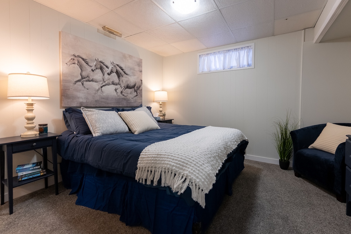 KING SUITE***Cozy 1-bedroom king suite- completely separate entrance, new build construction with private yard and cement patio, off-street parking with a plug-in for winter season. Features a king bed w/blackout blinds & queen sofa bed with luxury duvet beddings, full kitchen and washer/dryer. Enjoy in-floor heating throughout and 9-foot ceilings, creating a bright comfortable space perfect for privacy and relaxation. **** some days there is potential for noise transfer from the main dwelling