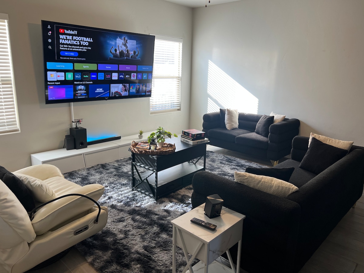 This Luxury Modern Home is made to suit all guests! Whether you are looking for a weekend getaway or a place for work and play, this home has everything to offer in beautiful Las Cruces, NM. Located in a brand new neighborhood near Red Hawk Golf Course and multiple family-friendly parks. Guests can rest peacefully in one of 4 bedrooms and enjoy amenities such as an outdoor grill, outdoor living area, lawn games, board games, and most kitchen items. High-speed Internet included and SmartTVs.