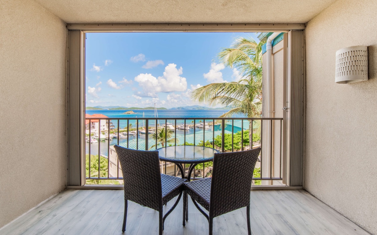 Beautiful ocean view, top floor studio with balcony at Sapphire Village is perfect for two guest and features a queen size bed. Kitchen and private balcony with spectacular views. Five minute walk to Sapphire Beach, two large pools, two great casual restaurants, coffee shop, taxi stand, and laundromat all on site. The marina has several day excursion options to keep your days full. Sailing trips, parasailing, or rent a wave runner. Everything you need is right on the property.
