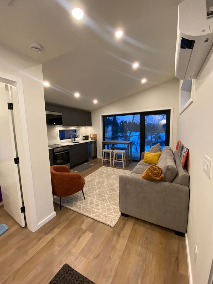 Bright, modern, quiet above-ground suite with private outdoor patio. Mountain bike, walk/hike to local trail network; beautiful road biking, disc-golf, local pool access. Short walk to downtown, restaurants & pubs, local museums and attractions. Washer/dryer, gear storage, private entrance and parking for 1+ vehicles on property. A warm welcome to our space, Jamie and Anne-Marie enjoy meeting and accommodating visitors. 2023 Business License #4985