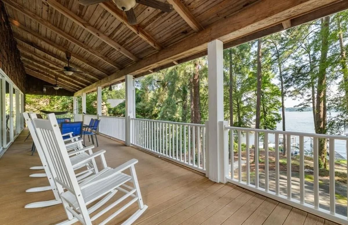 🌊 Escape to Treasure Cove – Lake Gaston Waterfront Retreat * Partially renovated, LAKEFRONT tucked in small cove with main lake views from kitchen, porch, and more * Rare private sandy beach and deep water access from dock and boat house * All new furniture and mattresses; 100% cotton sheets * Pet friendly up to two dogs * Game Room w/arcades, THEATER area with comfy couches and large viewing screen * Linens/Shower towels included * 3 king bedrooms and 1 king with bunks bedroom; 3 baths