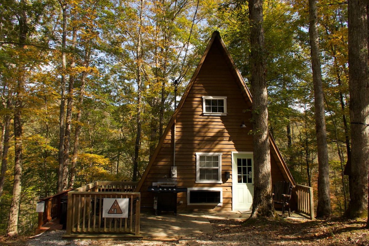 **NOW WITH HOT TUB** Mint Condition, a darling A-Frame, is perched in the prime spot at Red River Gorge. This charming cabin, one of our five updated gems, nestles among the trees of "The Ridge." Whether you unwind on your private porch or in a hammock, gather around the communal fire pit with friends after an adventurous day, or simply find peace and tranquility in nature, Mint Condition offers a clean, chic, and cozy haven. Your ideal Gorge vacation begins here!