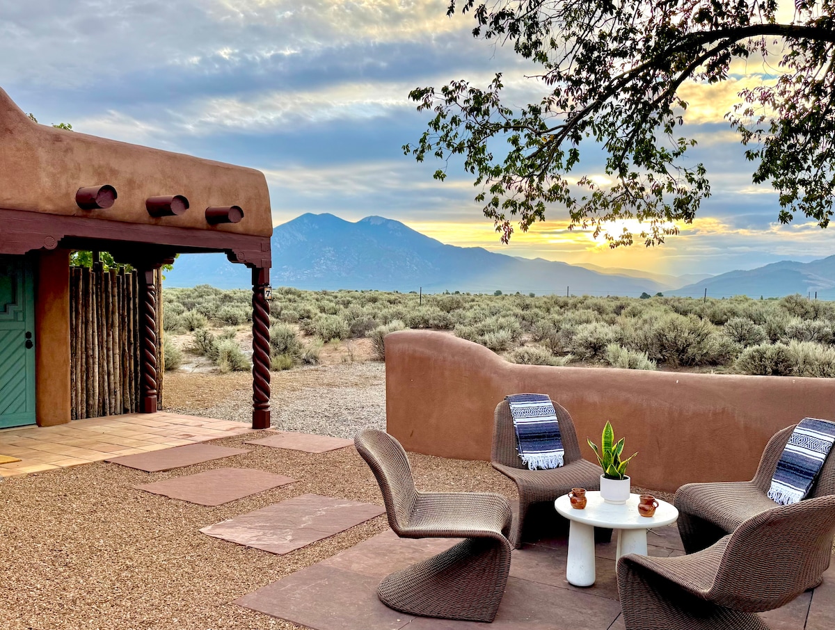 CHARMING ARTIST'S GUESTHOUSE: The Most Fabulous Views In Taos, New Mexico w/Hot Tub & Private Deck, A/C, Hi-Spd WiFi, Smart TV w/Cable & VIEWS, VIEWS, VIEWS!!! Whether you seek a tranquil retreat for solitary pursuits, a cozy base for daytime ski activities or a romantic getaway, enjoy our beautiful private setting w/ breathtaking views for less than the cost of an in-town motel room! **Rate incl 7.5% NM sales tax . . . . .